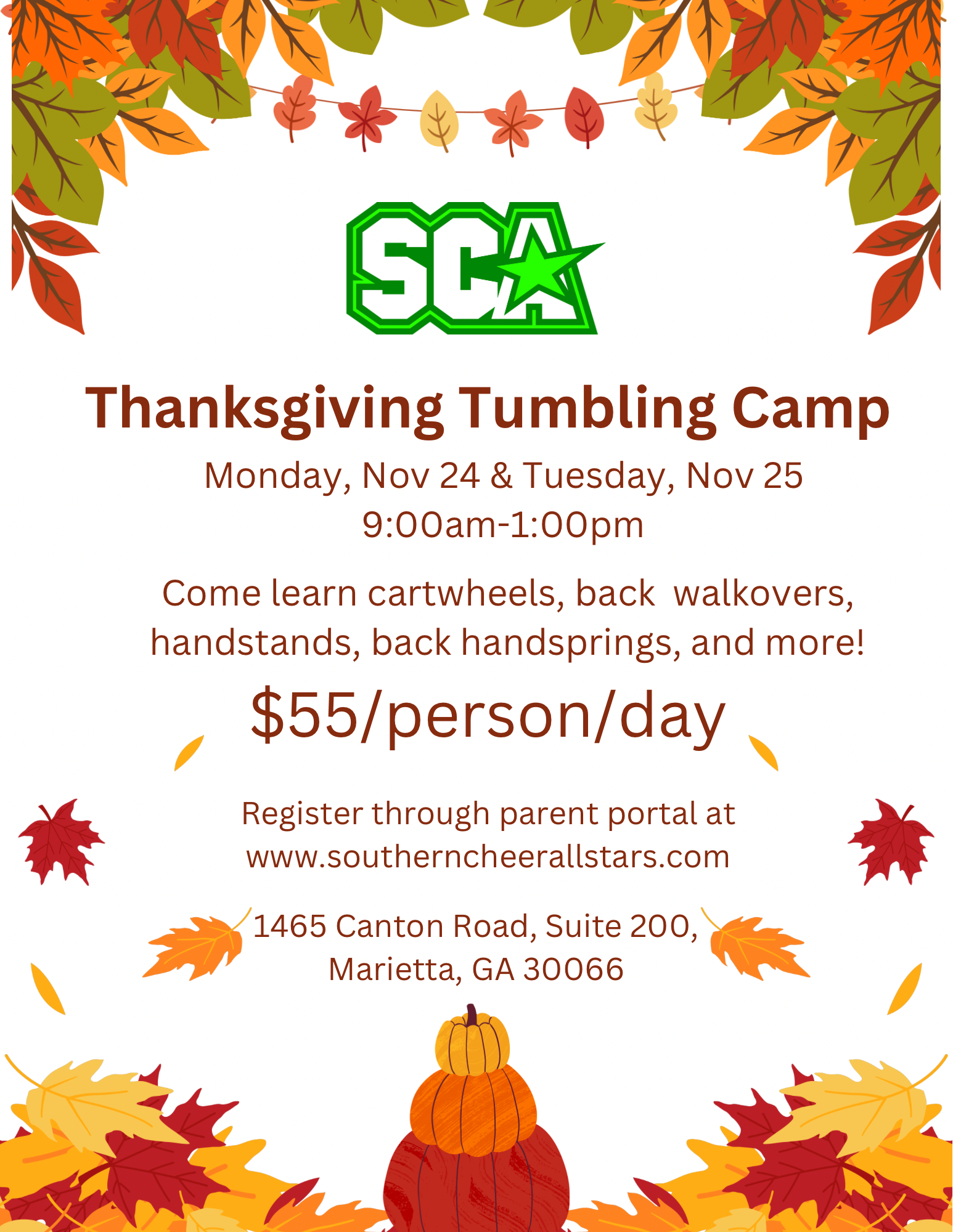 Upcomingevents Thanksgiving Tumbling Camp November 24th & 25th Register with the Parent Portal link above!